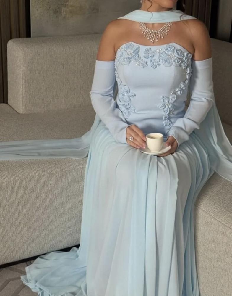 فستان سماوي بشال طويل