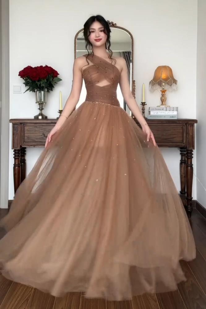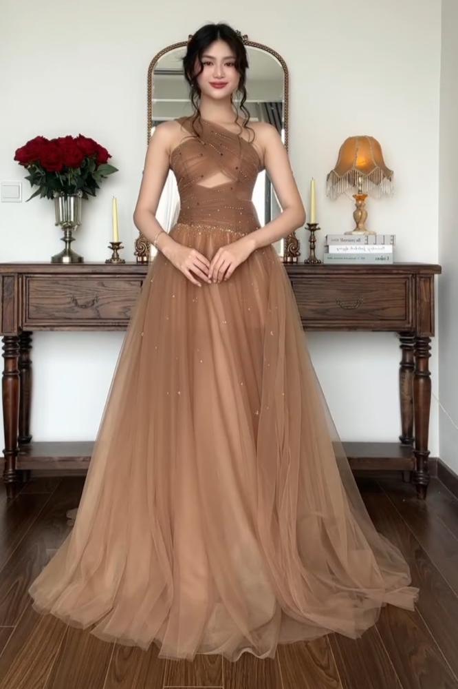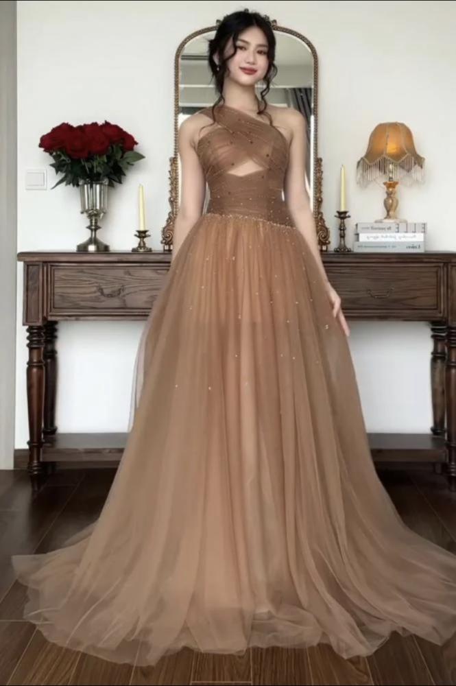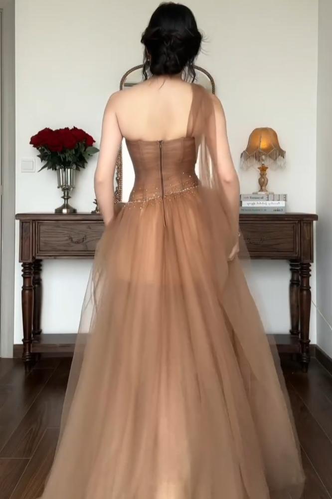 فستان بني فاتح سهرة