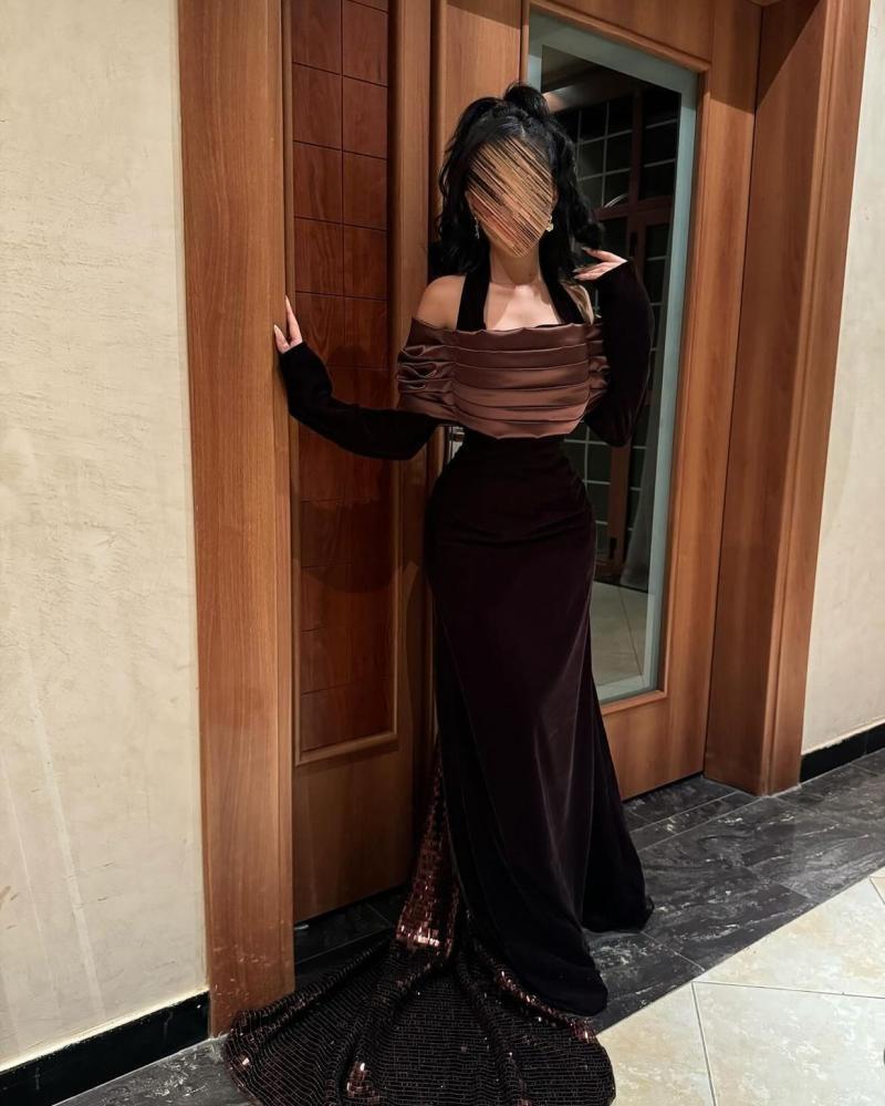 الفستان الأسود ميكادو يتميز بتصميم فخم يجمع بين الأناقة والبساطة. يأتي الفستان بقصة ضيقة عند الخصر ليبرز جمال القوام، ثم ينسدل بتنورة واسعة وطويلة تصل حتى الأرض، مما يمنح الإطلالة طابعاً ملكياً. منطقة الصدر بقصة ناعمة ” أو بتصميم مستقيم يعكس الأناقة الكلاسيكية، مع حمالات رفيعة تضيف لمسة أنثوية ناعمة. قماش المخمل يمنح الفستان لمعة خفيفة تحت الضوء، ويعزز من فخامته ورقيّه. يمكن تنسيق هذا الفستان مع إكسسوارات بسيطة كحقيبة صغيرة أو حلي ذهبية ناعمة، ليكتمل المظهر بأسلوب أنيق وجذاب يناسب المناسبات الراقية